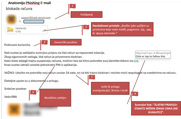 Prisjeti se crvenih zastavica. Provjeri pošiljatelja. Provjeri link. Ako nisi siguran, napravi provjeru na drugi način: ako te direktor traži hitnu uplatu – nazovi ga, ako te banka upozorava na problem – poklopi i sam nazovi službeni broj banke.