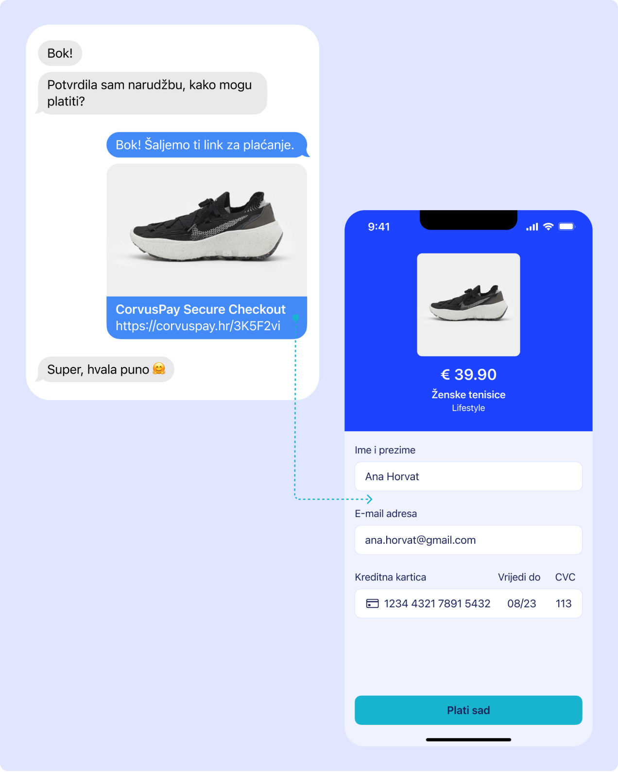Klikom na link kupcu se otvara forma za plaćanje u koju unosi podatke za plaćanje. Nakon uplate stiže ti informacija na email ili u tvoj sustav, ako koristiš API.