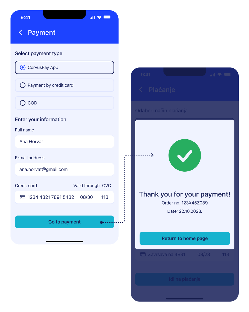 Prilikom plaćanja, kupac iz tvoje mobilne aplikacije može da otvori CorvusPay aplikaciju i da plati brže korišćenjem pohranjene kartice.